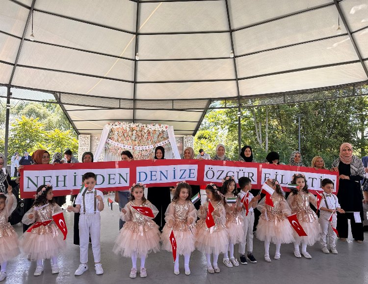 Öğrencilerin Kur’an-ı Kerim tilavetiyle başlayan programda ‘Nehirden Denize Özgür Filistin’ pankartı taşıyan öğrenciler ve öğreticilerin verdiği anlamlı mesaj dikkat çekti.